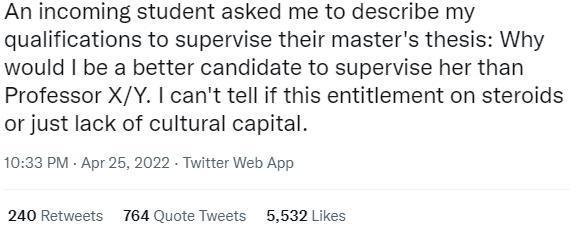The tweet above is tweeted by an Asian American women professor in sociology, Prof X, who serves as the director for the Centre for Research on Social Inequality. My understanding of the original post (OP)’s intention is to invite discussion and reflection on the inequity and (micro) aggression directed towards women of racialized communities in academia; in this case, from a student.